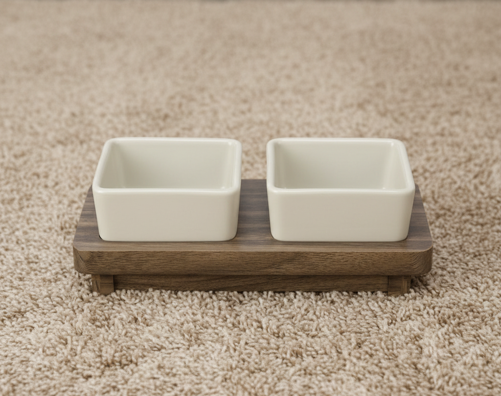 Este comedero para perro combina diseño moderno y funcionalidad para ofrecer a tu mascota una experiencia de alimentación cómoda y estilosa. Incluye dos cuencos de cerámica de 400 ml cada uno, colocados sobre un soporte elevado de madera MDF con base de silicona antideslizante, lo que garantiza estabilidad y evita movimientos mientras tu perro come o bebe.